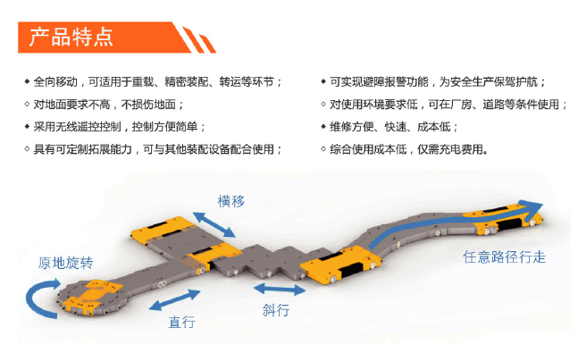 全向輪AGV采用麥克納姆輪機(jī)構(gòu)進(jìn)行定制組合,麥克納姆輪是一種可二維平面無(wú)死角任意漂移的高精度移動(dòng)輪組形式,通過(guò)單獨(dú)控制輪子的轉(zhuǎn)速、轉(zhuǎn)向?qū)崿F(xiàn)車的直行、橫行、斜行、原地旋轉(zhuǎn)、各種連續(xù)曲線的移動(dòng)。運(yùn)動(dòng)靈活、平穩(wěn),通過(guò)位置細(xì)微調(diào)整實(shí)現(xiàn)精準(zhǔn)定位和高精度軌跡控制。作為平面高精度移動(dòng)設(shè)備運(yùn)用于航空航天、船舶、軌道交通、工程機(jī)械、倉(cāng)儲(chǔ)物流、電力電氣、國(guó)防科工、科研教學(xué)等等眾多領(lǐng)域。