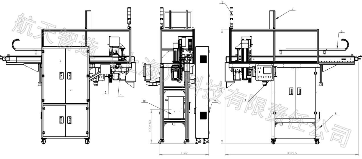 硅片單片很薄、堅(jiān)硬、脆,考慮工況水質(zhì)浸泡的環(huán)境治具要變形小。治具材料采用硬PVC材料阻燃,硬度高,韌性好,吸濕小。按8寸硅片尺寸設(shè)計(jì)內(nèi)框限位,單邊放4mm間隙。承載量為800片硅片設(shè)計(jì)治具高度和承載力,安裝板螺紋底孔內(nèi)嵌螺紋鋼套。底板設(shè)計(jì)清洗分片機(jī)的定位孔,入口孔帶倒角方便引導(dǎo)。底板四角設(shè)計(jì)內(nèi)圓弧角,用于前后治具跟進(jìn)時(shí)的隔斷。左右側(cè)板設(shè)計(jì)機(jī)械手抓取前的限位導(dǎo)向,當(dāng)機(jī)械手下降時(shí)自動(dòng)導(dǎo)正治具后到位抓取。斜度板設(shè)計(jì)角度符合清洗分片的角度。抓板設(shè)計(jì)同時(shí)滿足人工和機(jī)械手搬運(yùn)。后板設(shè)計(jì)要挖空,方便人工放置硅片操作。后板并設(shè)計(jì)有RFID芯片安裝位。 圖二硅片載體治具示意圖 1.底板 2.側(cè)板3.斜度板4.抓板5.后板 機(jī)械手設(shè)計(jì) 機(jī)械手系統(tǒng)由氣動(dòng)控制組件、接線盒、三色燈報(bào)警器、LED顯示器、機(jī)架框架、機(jī)械手桁架組件、觸摸屏控制組件、保護(hù)罩殼、控制電箱、治具緩存水箱組成。如圖三所示。氣動(dòng)控制組件和接線盒方便于能源接入。三色燈報(bào)警器時(shí)時(shí)動(dòng)態(tài)顯示設(shè)備狀態(tài),便于維護(hù)。LED顯示器主要顯示設(shè)備的料號(hào)信息。機(jī)架框架設(shè)計(jì)滿足機(jī)械手桁架組件和治具緩存水箱的安裝和承載??蚣苤С懈叨燃骖櫇M載治具輸送、治具緩存水箱、清洗分片位、空治具回流輸送功能需求。機(jī)械手桁架組件設(shè)計(jì)滿足硅片滿載治具的輸送、緩存、清洗分片位的上料、空治具回的流橫移和上下料的承載、行程。觸摸屏控制組件設(shè)計(jì)有自動(dòng)和手動(dòng)模式,方便調(diào)試、維護(hù)、管理。保護(hù)罩殼將機(jī)械運(yùn)動(dòng)機(jī)構(gòu)做安全防護(hù),防止意外。治具緩存水箱設(shè)計(jì)防止一刀料全部到齊,造成輸送線體堵車作為緩存。緩存位物料少于2件時(shí)啟動(dòng)叫料考慮中間環(huán)節(jié)備料時(shí)間。 圖三機(jī)械手系統(tǒng)示意圖 1.氣動(dòng)控制組件2.接線盒3.三色燈報(bào)警器4.LED顯示器5.機(jī)架框架6.機(jī)械手桁架組件7.觸摸屏控制組件8.保護(hù)罩殼9.控制電箱10治具緩存水箱 (1)桁架機(jī)械手組件設(shè)計(jì) 桁架機(jī)械手由橫移移栽模組、垂直移栽模組、機(jī)械手組件、拖鏈組件、接線盒組成。如圖四所示。橫移移栽模組行程滿足現(xiàn)場(chǎng)布局,移栽橫移位涉及滿載治具輸送、治具緩存水箱、清洗分片位、空治具回流輸送的精確位置,采用伺服電機(jī)驅(qū)動(dòng)。移載行程范圍內(nèi)設(shè)計(jì)零點(diǎn)、左右兩邊的極限位、中間設(shè)置加減速感應(yīng)位。橫梁采用型材鋼結(jié)構(gòu),導(dǎo)軌安裝為T型安裝方式,安裝面貼板焊接加工保持平行度和垂直度。移栽極限位設(shè)計(jì)機(jī)械硬限位。牽引方式采用皮帶。 圖四桁架機(jī)械手示意圖 1.橫移移栽模組2.垂直移栽模組3.機(jī)械手組件4.拖鏈組件5.接線盒 垂直移栽模組高度行程涉及滿載治具輸送、治具緩存水箱、清洗分片上料位、空治具回流輸送系統(tǒng)。設(shè)計(jì)時(shí)除清洗分片上料位高度外,其余高度設(shè)計(jì)一致。高度的行程以最低點(diǎn)容許富余量50mm。由于高度不同垂直提升采用抱閘伺服電機(jī)驅(qū)動(dòng)。提升機(jī)構(gòu)設(shè)計(jì)為導(dǎo)軌滑塊和滾珠絲桿方式。移載行程范圍內(nèi)設(shè)計(jì)零點(diǎn)、上下兩邊的極限位、中間設(shè)置加減速感應(yīng)位。 (2)治具緩存水箱設(shè)計(jì) 治具緩存水箱放置在機(jī)械手橫移框架內(nèi)并固定。如圖五所示。緩存水箱的線體中心位置與機(jī)械手移載中心位置重合。機(jī)械手將輸送線體的滿載治具緩存在水箱中。治具緩存水箱由水箱本體、水下輸送線體、物料檢測(cè)、截停機(jī)構(gòu)組成。 圖五緩存水箱安裝位示意圖 水箱材料采用不銹鋼鈑金,拼接焊接而成密封不能漏水。水箱設(shè)計(jì)有進(jìn)水口和排水口方便水定時(shí)更換且設(shè)有液位傳感器。水箱外有與框架固定的安裝板。水箱內(nèi)安裝有輸送線體,用于輸送治具。水箱上料位設(shè)計(jì)有料感應(yīng),感應(yīng)有料啟動(dòng)輸送。水箱內(nèi)可以緩存4個(gè)治具位置加1個(gè)放料位滿足5個(gè)治具位置尺寸空間。每處位置都有有料感應(yīng),防止?jié)M料放料或疊料。輸送前端設(shè)計(jì)有截停機(jī)構(gòu),當(dāng)治具到上料抓取位時(shí)截停機(jī)構(gòu)啟動(dòng)阻斷緊跟后面的治具,防止抓取提升帶起。 圖六緩存水箱結(jié)構(gòu)示意圖 1.水箱本體2.水下輸送線體3.治具4.輸送驅(qū)動(dòng)5.物料檢測(cè)6.截停機(jī)構(gòu)治具 03 推 廣 前 景 和 結(jié) 論 本文設(shè)計(jì)的一款硅片載體治具自動(dòng)上料機(jī)械手,在整體車間13條清洗線實(shí)施后,硅片脫膠和清洗前的分裝、搬運(yùn)、分配、上料環(huán)節(jié)中實(shí)現(xiàn)了僅在硅片脫膠后往治具分裝硅片需人工作業(yè),大大減輕了勞動(dòng)強(qiáng)度。不同型號(hào)的硅片清洗對(duì)應(yīng)的不同清洗設(shè)備可以在產(chǎn)線中實(shí)現(xiàn)自動(