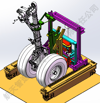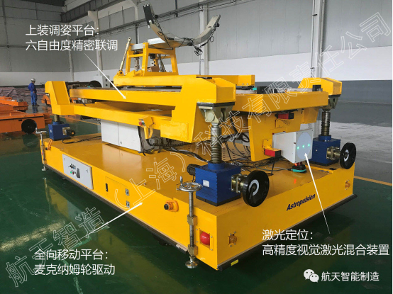 該項目為某大型客機專門定制的起落架安裝裝置,采用麥克納姆輪做為移動機構(gòu)可任意方向高精度的移動,配置六自由度調(diào)姿機構(gòu)完成精確安裝對接。全向移動平臺采用我司成熟的麥克納姆輪技術(shù),能夠?qū)崿F(xiàn)高精度、零回轉(zhuǎn)半徑的全向移動,由于在起落架安裝環(huán)節(jié)現(xiàn)場空間比較小,裝配環(huán)境復(fù)雜,用麥克納姆輪組作為移動機構(gòu)可以完全解決這個問題;調(diào)姿部分以伺服電機控制用于實現(xiàn)精確的六自由度調(diào)姿,以便于在起落架安裝時實時精準的調(diào)整安裝位置。