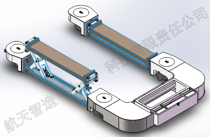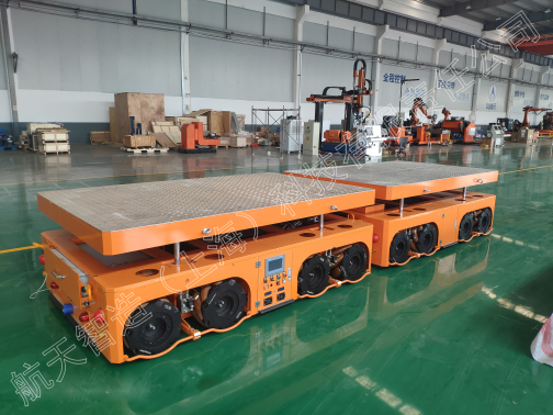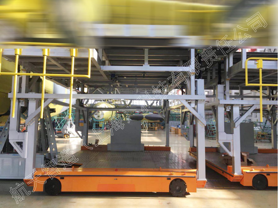 機塢AGV平臺的設(shè)計制造可以滿足飛機總裝生產(chǎn)過程中,機頭、機身、機翼及尾段各部位的安裝工作,為操作人員提供高空作業(yè)工作平臺,根據(jù)工作需要電控移動和改變升降高度對整機進行工作平臺的設(shè)計;整體工作平臺分為:雷達艙工作梯、風(fēng)擋雨刷工作、機翼工作平臺、尾段工作平臺、罩體工作平臺、前登機門工作、前應(yīng)急門登機、后登機門登機、起落架工作梯、機艙內(nèi)工作梯,所有工作平臺入位后對合包圍飛機,機翼平臺分為三段,采用我司自主研發(fā)的三車聯(lián)動控制來實現(xiàn)整體或分段的移動,平臺上集成生產(chǎn)用工具、物料放置架、生產(chǎn)所需動力源、數(shù)據(jù)源接口、垃圾投放通道等功能。大翼和尾段工作平臺采用全向輪移動,所有工作平臺根據(jù)現(xiàn)有廠房尺寸合理布局,能快速移動,方便飛機進出機庫。